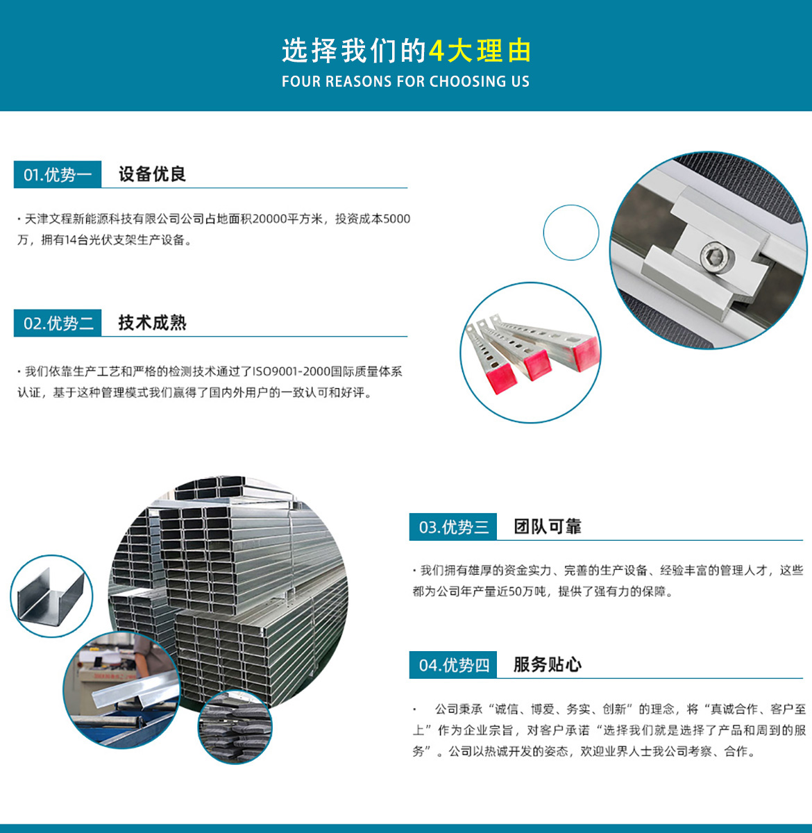 關(guān)于我們天津文程新能源科技有限公司成立于2021年,是專注于集中式、分布式、漁光互補(bǔ)和農(nóng)光互補(bǔ)等清潔能源發(fā)電的綜合性企業(yè) 公司是集設(shè)計(jì)、研發(fā)、生產(chǎn)、制造為一體的綜合型企業(yè)。公司占地面積20000平方米,注冊資金5000萬元整。公司坐落于華北鋼鐵重鎮(zhèn)--大邱莊,距天津市區(qū)50公里、鄰104和205國道及京滬高速,交通十分便捷。 本公司擁有三個(gè)生產(chǎn)車間,其中兩個(gè)冷彎型鋼車間,一個(gè)鋅鋁鎂型鋼車間,擁有自動冷彎成型機(jī)10條,自動數(shù)控沖孔機(jī)10條以及焊接加工等設(shè)備。主要生產(chǎn)產(chǎn)品有:太陽能光伏支架、各種規(guī)格的C/Z/U型鋼、抗震支架、管廊支架及整套配件等。